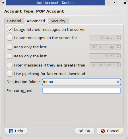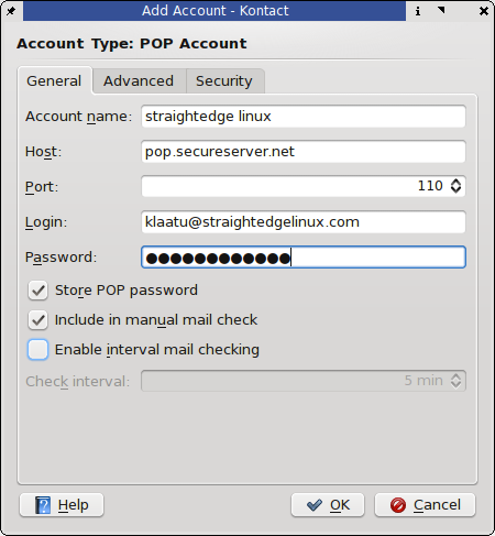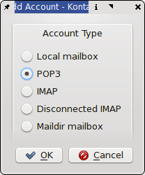 For POP3: fill in all the blanks, where "Account name" is just something for you to name the account so you know which email address it is fetching mail from. The "Host" is very specific to your email provider and you'll need to find out from them what their hostname is; typically the best way to get this info is to Internet Search how to setup your foobar account and you'll often come across that email provider's tutorial on what to put into either Thunderbird or Outlook; just take the relevant information from those tutorials and plug them into the right places here. The "Login" name is also a little tricky; sometimes an email provider just wants you to login with a username, like "klaatu". Other times they want your entire address, like "klaatu@foobar.com"...again, the online tutorials you find from your email provider will most likely give you this information. There are a few checkboxes at the bottom that are fairly self-explanatory (and if not, just leave them as is). The most important one, I find, is the selection to include that account in the "Check Mail" action; that is, when you click "Check Mail" in Kmail, does that account get checked along with all your other accounts? or do you need to go through and check each account individually? The latter defeats the purpose of having an email client, for me, so I always include all accounts in the "Check Mail" action.
