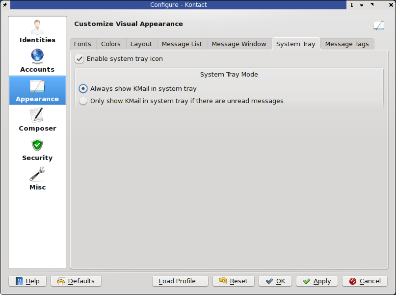 This is the default Kmail configuration window. Notice the icons on the far left...in fact, notice how much of KDE uses many of the same concepts across all of its applications. Once you start getting used to one application in KDE, like Kontact, and you will start to feel quite at home with the rest of KDE. So if you're new to Linux entirely, you might want to just start using simple applications like Kontact to check your email, and gradually you'll find yourself branching out to other applications and feeling more comfortable with Linux+KDE at large.