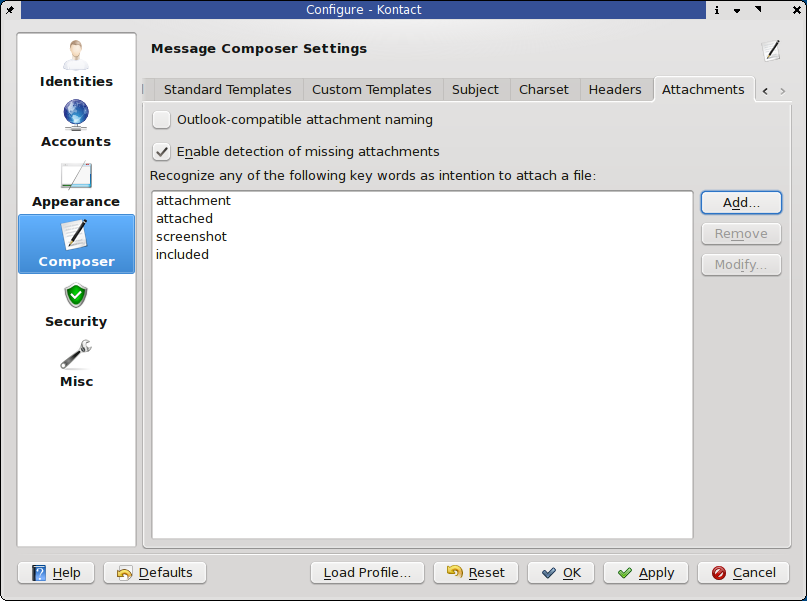 There's a neat feature that notices if you mention the word "attach" or attached" in the body of your email but are not attaching anything to that message; Kmail will prompt you and make sure you actually want to send a message without an attachment even though you apparently speak of attachments in the body. This is a life saver, and I have expanded the keywords to include things like "included" and "attaching" and "screenshot". You can customize the list or disable this feature, or whatever you want, in the "Attachments" tab of the Kmail configuration.
