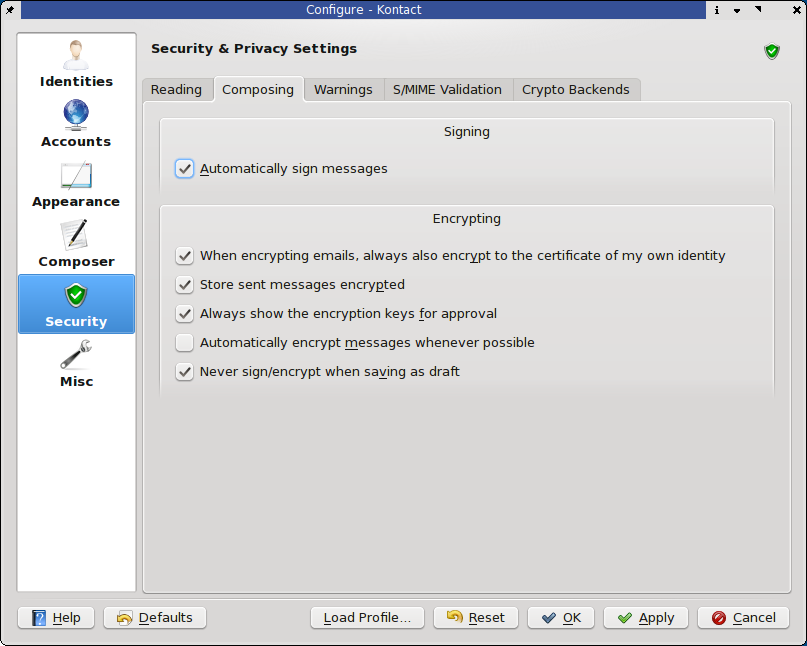You can also set how automated you want the use of these keys to be. Do this in your Kmail Configuration screen; just click on the "Security" category on the left and you'll see all the options you need. I typically leave the "Automatically Signed" activated, and I believe all the other defaults met my needs and never required changing.