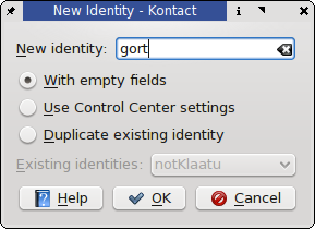 Back in the Identities configuration, we see that we have two identities. One will be set as the Default, and the other will have a button giving you the option to set it as the new default. I use Klaatu as my default because I use Kmail for personal emails more often than for Gort/professional ones.