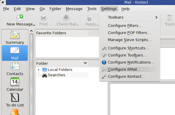 To set up Kmail, go to the Settings menu at the top of Kontact and select Configure Kmail.