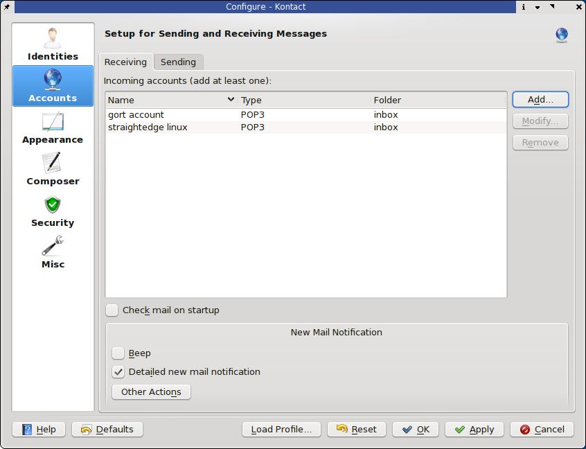 NOW you really are done. Almost. As long as you've added all the accounts you want to check, and you have set up some Identities for yourself as needed, you are ready to receive email in Kmail. So go back out to the main window and click "Check Mail" and watch all your messages arrive. You'll notice on the left column of Kmail, a list of all your accounts and the mailboxes within.
