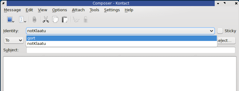 But for now just click the "New Message" icon at the top left of Kmail, to compose a new message. Since this is the first time using the New Message window, you'll need to set it so that it shows which Identity you can send your message as. To do this, go to the View menu and select to view "Identity".