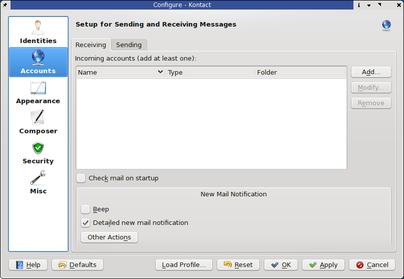 So you'll want to select the Account icon on the left of the Kmail configuration window, and click "Add". Notice that you are in the "Receiving" tab, meaning that you are creating accounts that receive messages. Sending is another beast (or, to be more precise, another protocol) entirely and I'll step you through the way I handle this in a moment.