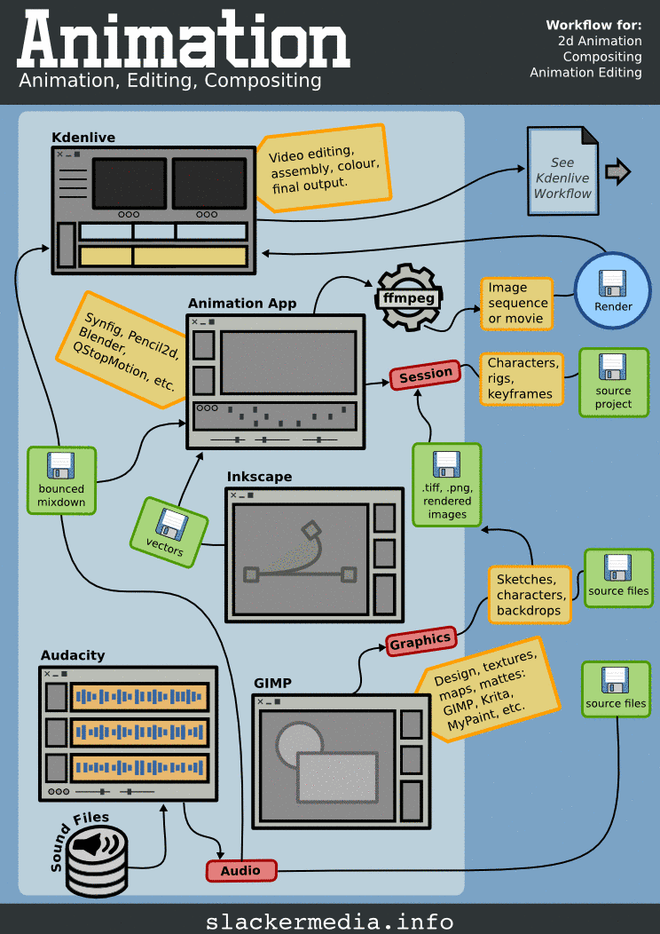Of course there are hundreds of ways to accomplish your goals, but you probably don't want to know all hundred ways. So Slackermedia has several suggested workflows to provide some direction for you. You can view them online here, or download them as self-contained PDF cheatsheets from the Downloads page.